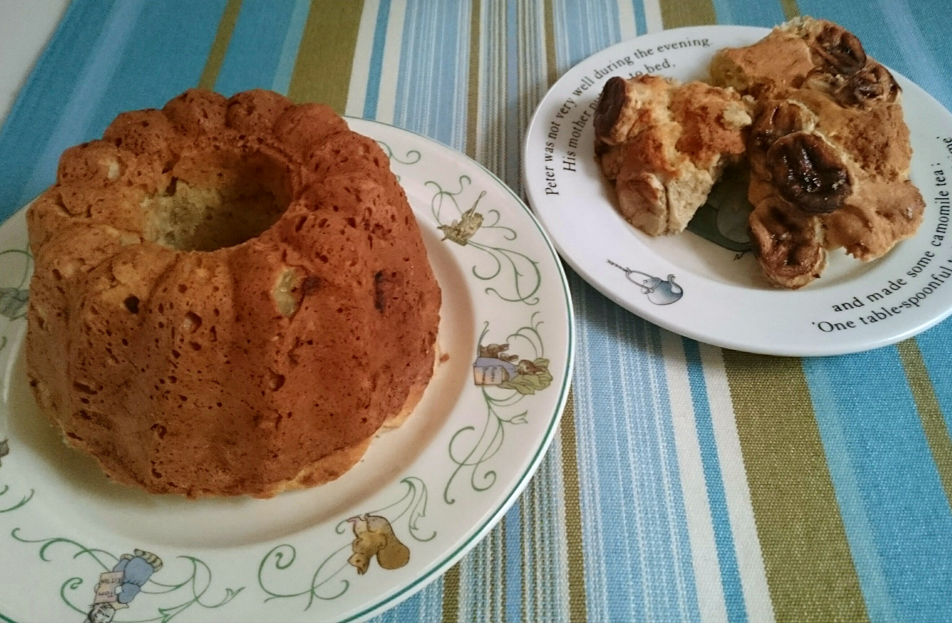 出来上がりは、ちょっとパサパサ感があったのですが、焼きすぎかな?それともベーキングパウダーのせいなんだろうか……?これを入れると、どんなに混ぜても膨らむから簡単なのですが、できたら入れないで作りたい!ケーキの断面も、パウダーの走った跡がついて美しくない(T_T)。