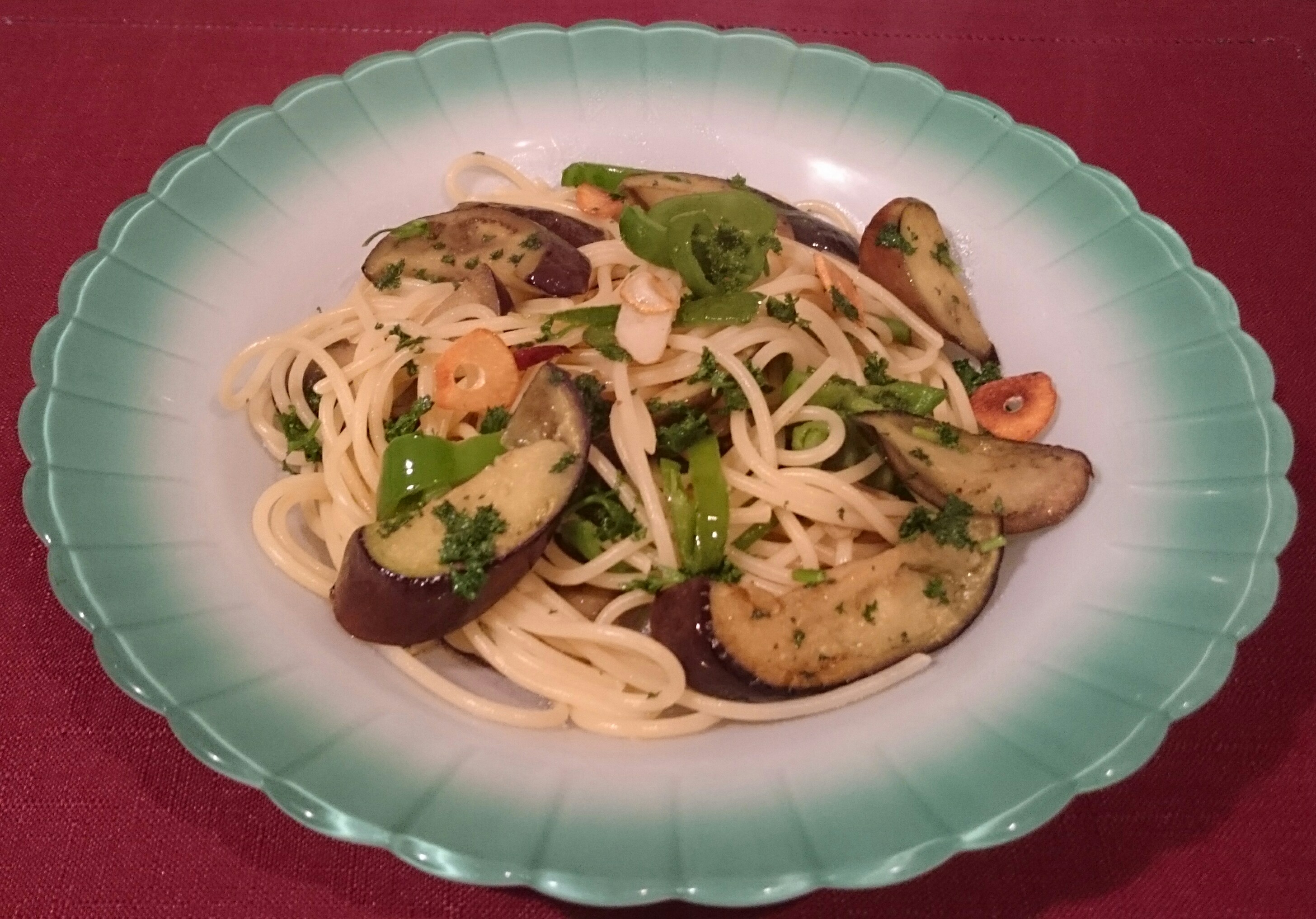 有り合わせの材料で、ペペロンチーノ(°▽°)。たまたまあった茄子とピーマンで作りました。ミニトマトを入れてもいいかな?やっぱりにんにく風味は美味しい(〃▽〃)✨