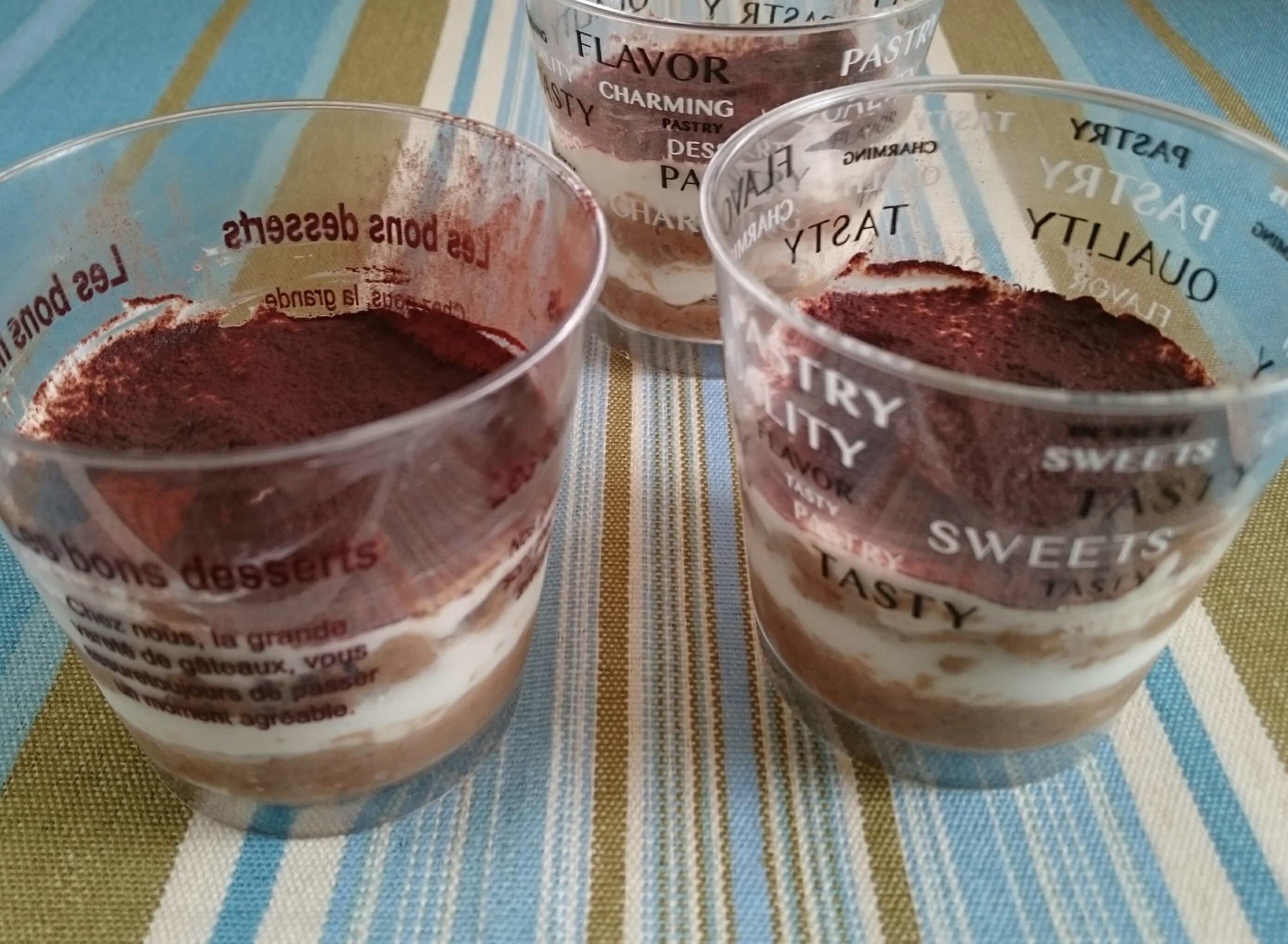 このヨーグルトにハチミツを少々混ぜておきます。そして砕いたビスケットに、溶いたコーヒーとカルーアを入れてふやかします。器にこのビスケットとヨーグルトを交互に入れ、最後にココアパウダーを茶漉しで振りかけたら、ティラミスの出来上がり(°▽°)✨
