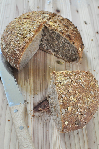 『リンデ』のケルネブロートの材料を調べ、ヒマワリの種やかぼちゃの種や、オートミール、ふすまなどたくさんの種や雑穀を練り込みます。生地の扱いもイーストの場合より時間がかかりましたが、焼きあがったときのいい香りで苦労が報われました^^;周りは固いのですが中はしっとりとしていて、噛むほどに香ばしい穀物の味がします。私はライ麦60%で作ってみたのですが、これくらいがいいみたい♪