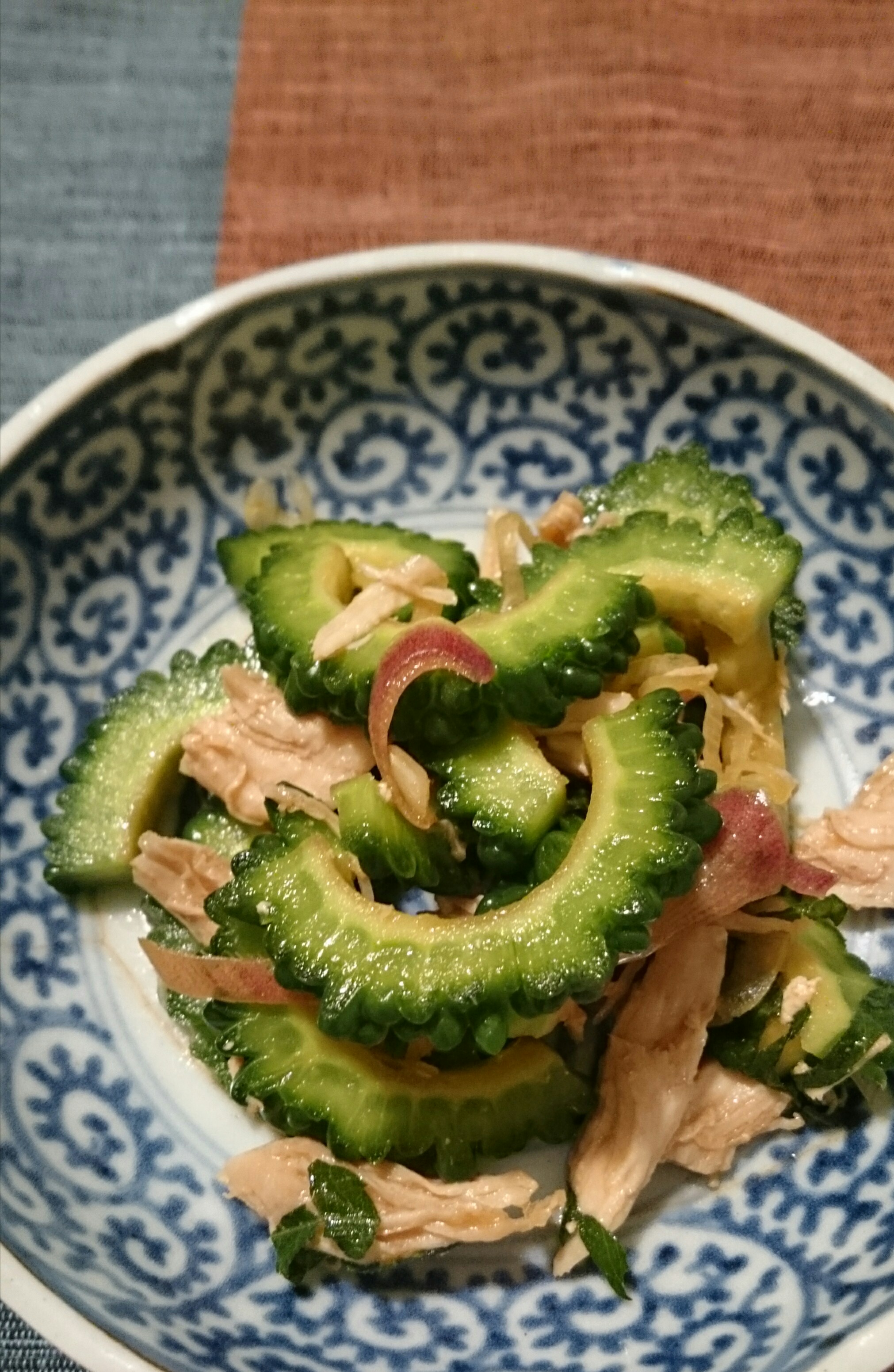 ゴーヤはスライスしてさっとゆがき、鶏ササミはゆでて細かく割いておきます。たれと和えて、生姜、みょうが、青じそを加える。(たれ→醤油、酢、ごま油)