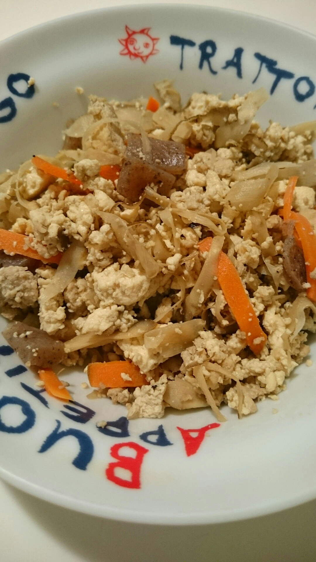にんじん、ごぼう、こんにゃく、鶏ひきの入った炒り豆腐(^o^)。最初にこれらを酒、醤油、だしと、生姜の絞り汁で炒り煮にしておきます。そのあと木綿豆腐を崩して加え、水分がなくなったら出来上がり。味をみて足りなければ醤油を足します。お豆腐ではなくご飯と一緒に炊くと五目炊き込みご飯になります。じつは具がまったく同じもの(^o^)。食べる時にさやいんげんの刻んだものなどを乗せるときれいです。