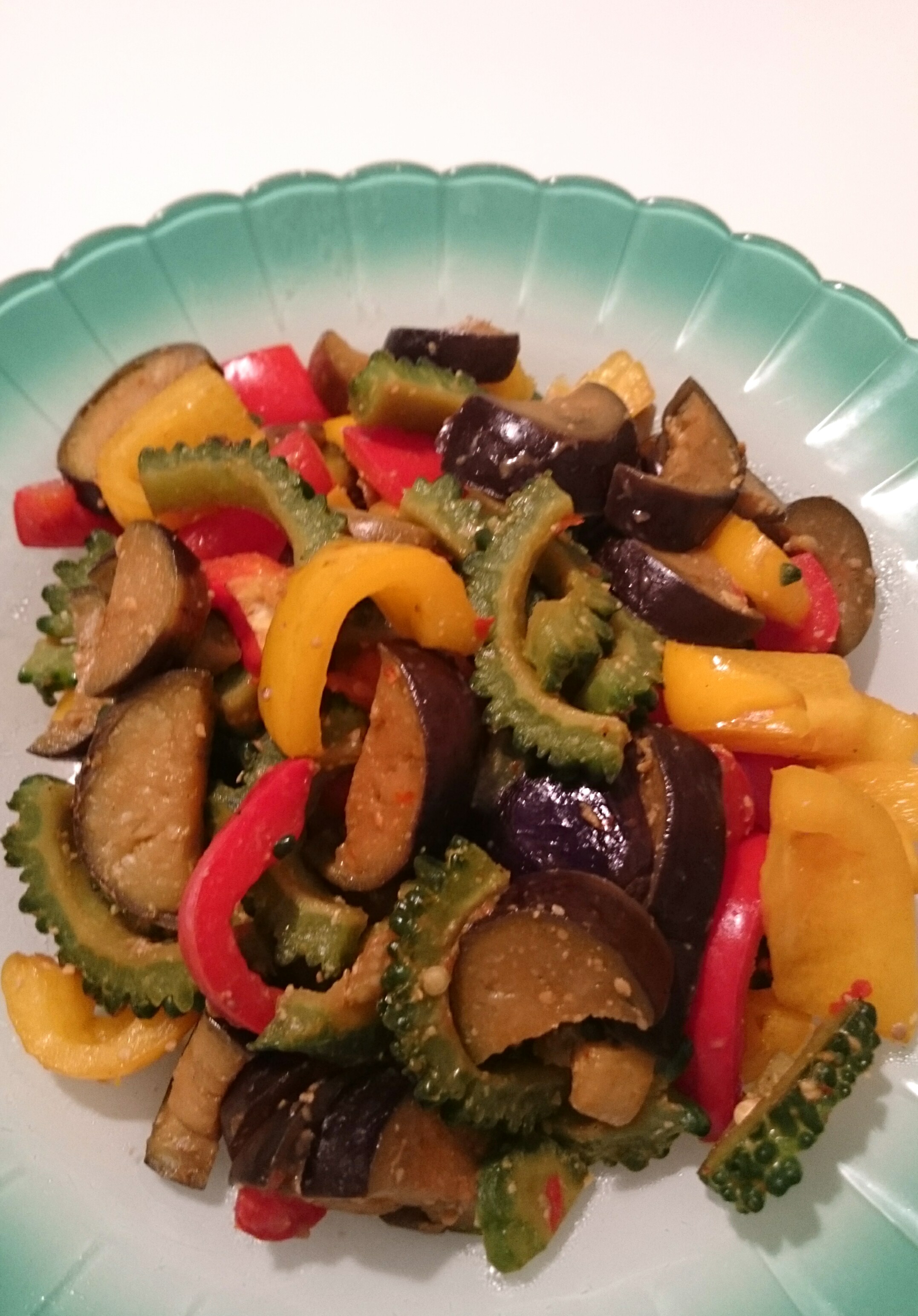 ゴーヤ、パプリカ、なすの味噌炒めです。豆板醤を入れて少し辛くしてみました。最近、ゴーヤが安くなってきたので嬉しい!なくなるとまた買ってきて、毎日のように頂いてます。チャンプルーが定番だけどサラダにしたり、酢の物などにしても美味しいです(^o^)
