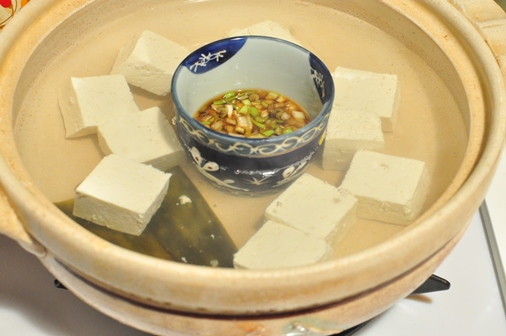 真ん中のたれは、煮切った酒にしょうゆとかつお節を入れて濾したものに、刻みネギを入れたものです。お豆腐と一緒に温めます。