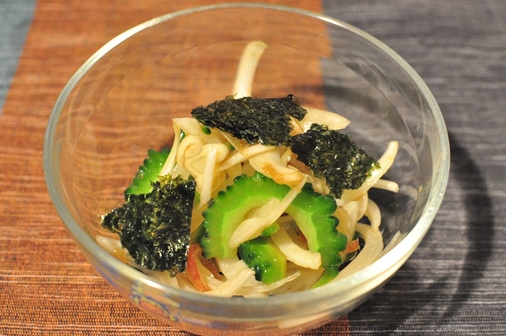 ゴーヤと新たまねぎの酢の物。海苔をふりかけて頂きます(^○^)