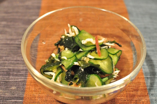きゅうりとしらすの酢の物。しらすの代わりにたこを入れたりしても美味しいです。