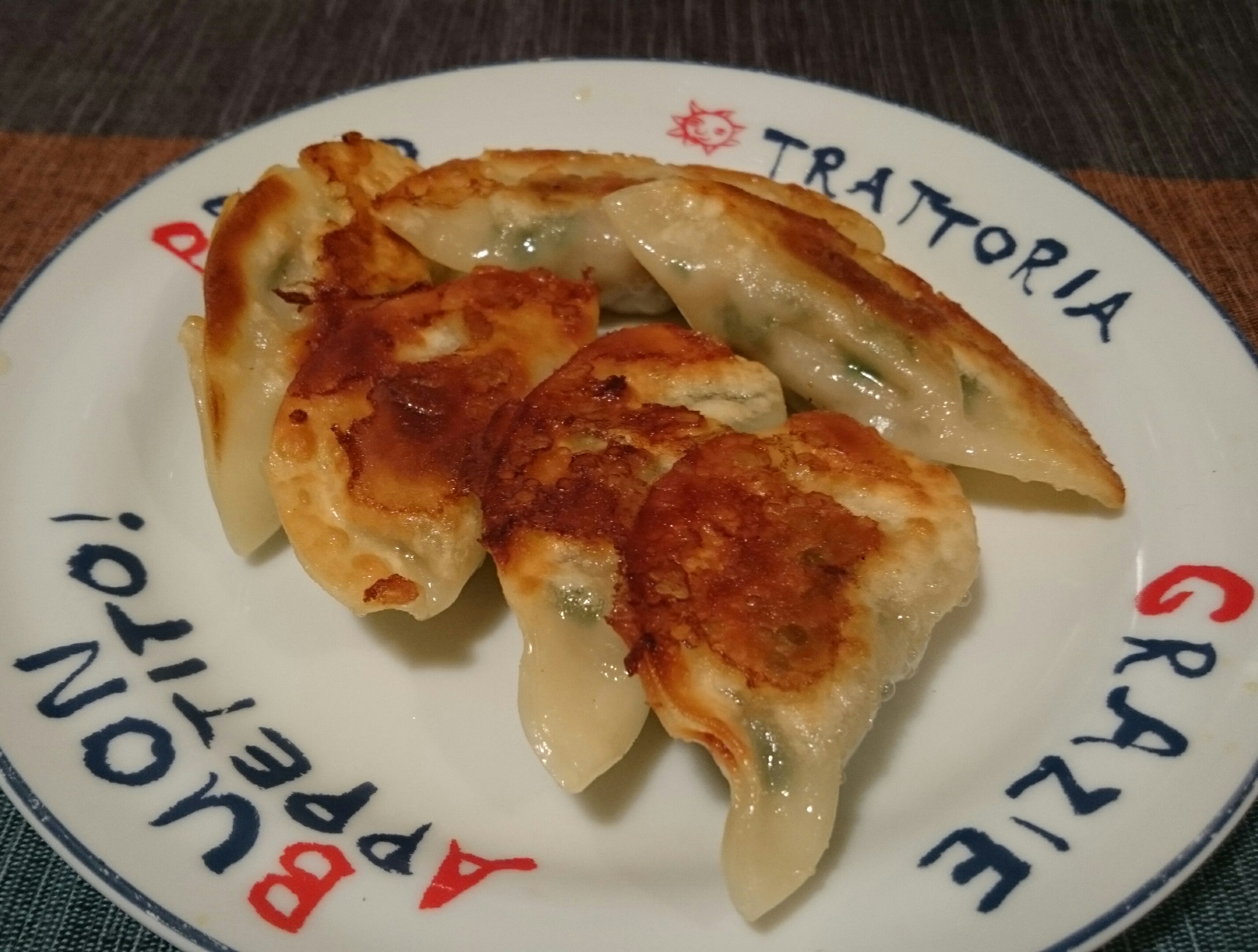 手作り餃子(°▽°)♪買って食べるのも美味しいのですが、家で作るとたくさんできます♪キャベツとニラをたっぷりと。キャベツの代わりに白菜でも良いし、青じそとかいろんな野菜を入れるバージョンもあるみたい(^o^)。皮はちょっと厚めのものを使いました。皮が厚いと、これだけで主食になりそうなくらいボリュームある……。だから、ごはんは無くても寂しくない(?)。餃子はパリパリに焼くのが好みです✨でも、ごま油入れすぎかな……(´・ω・`)?