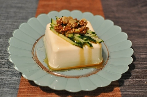 を混ぜて、刻んだきゅうりを載せた豆腐の上からかけて、出来上がり。