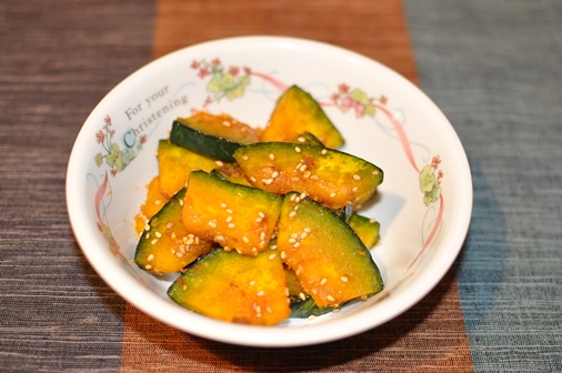 かぼちゃを蒸して、火が通ったら下記の材料を合わせたたれと和えて出来上がり。