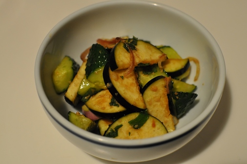 乱切りにしたきゅうりと薄くスライスしたなすにしょうゆを入れて、軽くもみます。しょうが、茗荷、青しそを入れて馴染ませたらできあがり。重石代わりに、水を入れたボウルを乗せておくと、しんなりします。とっても簡単、夏の食卓の箸休めにいかがですか??塩麹やしょうゆ麹があったら、入れてみても美味しいかもしれません(^○^)