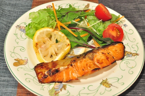 いつもは、塩鮭をそのまま焼いて食べることが多いですが、漬け魚とかムニエルにしても良いですね!付け合せは、残ったたれにきのこなどの野菜を漬けてグリルでさっと焼く、と書いてありましたが、半端な野菜がなかったのでグリーンリーフを添えました(^_^;)。たれはまだ残ってますので、ほかの料理にも使ってみようと思います。