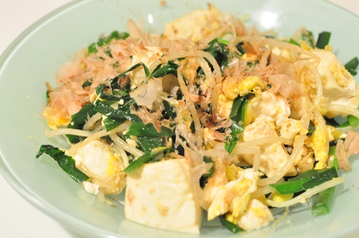 豆腐。木綿の固めのものを買ってくるのですが、炒めているうちに崩れてくる…一度茹でるとよいとか本には書いてあるけど、つい面倒で水切りを軽くしたあと炒めてしまってます。これがいけないのかなあ…??なんだか水も出てくるし…。最後に溶き卵を入れて混ぜ、しょうゆで味付け、おかかをたっぷりふりかけて頂きます。最高(^○^)/!!本当は沖縄のお豆腐を使いたいんですけど、なかなか売ってない…。たまにあっても高級品だから手が出ない…。以前、思い切って買って食べたときは、あまりの美味しさにびっくりでした。食感はとてもしっかりとしていて、大豆の味が濃厚、塩味がほんのりとついていてなにもつけなくても美味しかったです。炒めるのがもったいなくて、そのまま食べてしまいました。