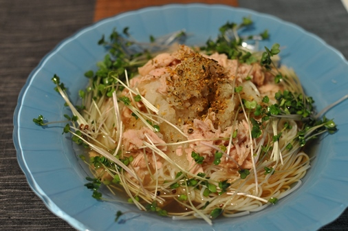 大根おろしの半量にめんつゆと七味唐辛子をまぜて、麺にかける。それから、軽く水気をきった大根おろし、ツナ缶(ノンオイル)をのせて水菜(カイワレ、スプラウト等)を散らします。