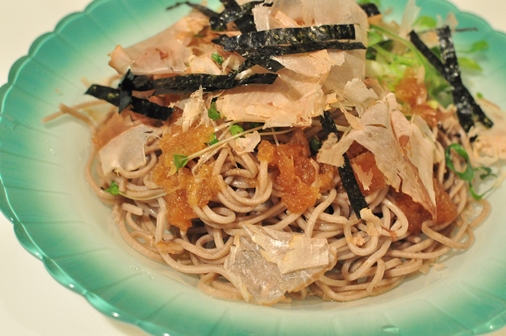 2.そばの上に回しかけ、ねぎ、かつお節、海苔、天かすを散らす。