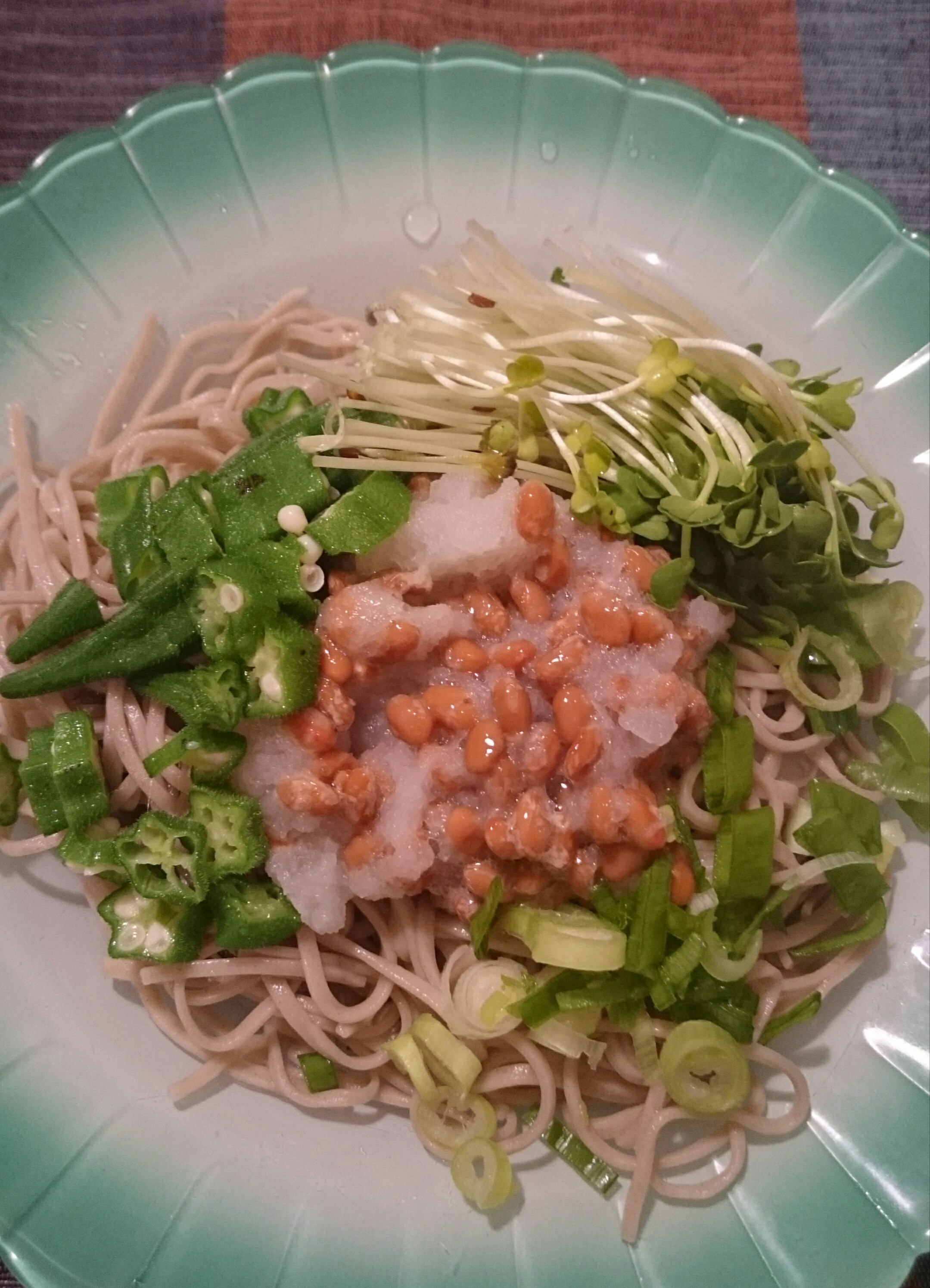大根おろしと納豆を混ぜて、蕎麦の上に乗せます。おくら、ネギなども。これにとろろとなめこがあったら最強なんですが(^∀^)。