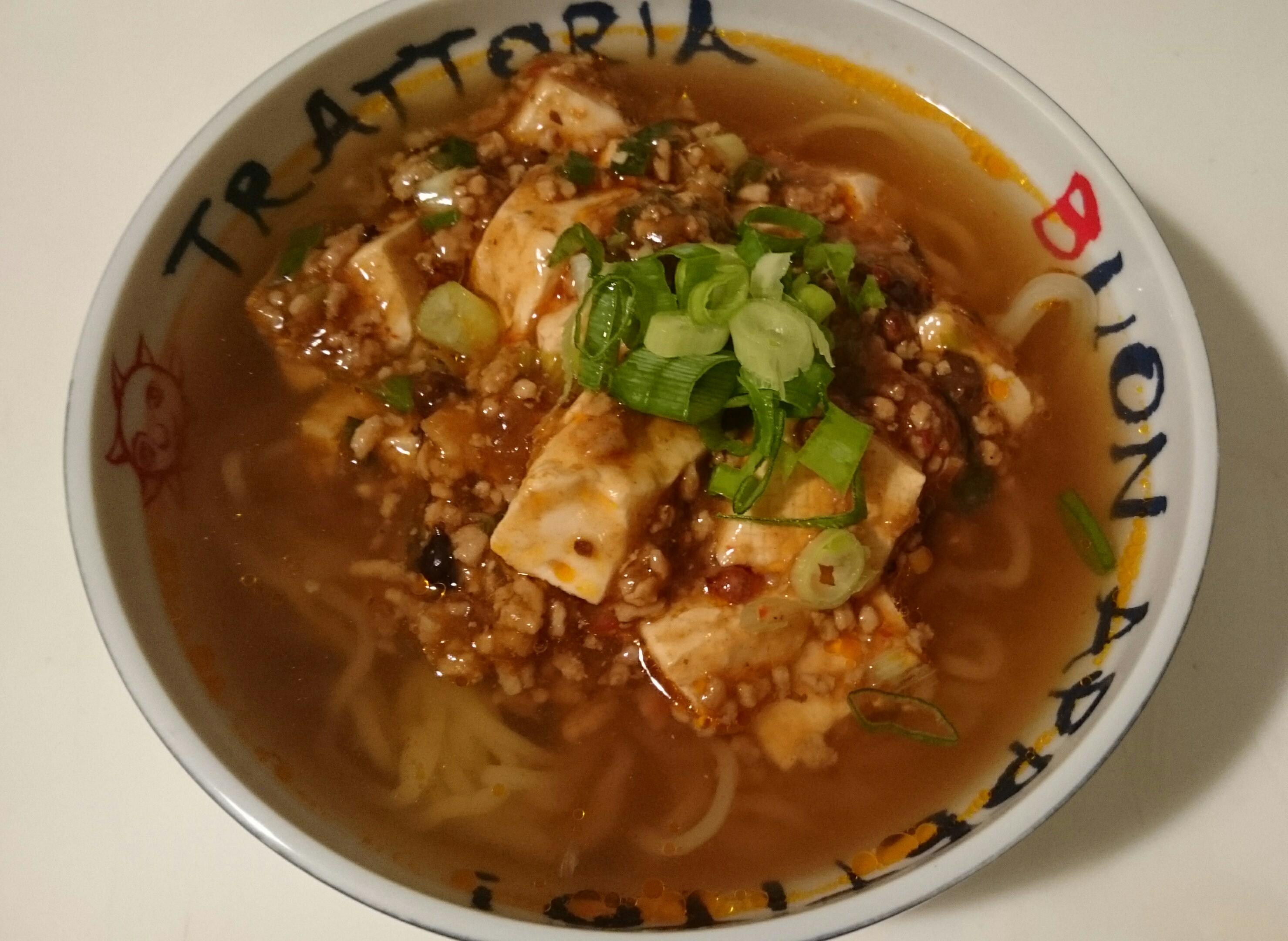 ラーメンに麻婆豆腐を乗せた食べ物。麻婆ラーメン。クックパッドにもたくさん載っていたので、初めて作ってみました。普通の醤油ラーメンの上に乗っけるのですね。私は、汁のない状態のラーメン&麻婆豆腐なのかと思っていました。なぜなら、せっかくとろみをつけた麻婆豆腐が、ラーメンスープでゆるくなってしまうから。えっ!これでいいの!?と半信半疑(-_-)?食べてみたら、なかなか美味しかったです。でも、やっぱりとろっとしてるのをご飯と一緒に食べる方がいいかなぁ……