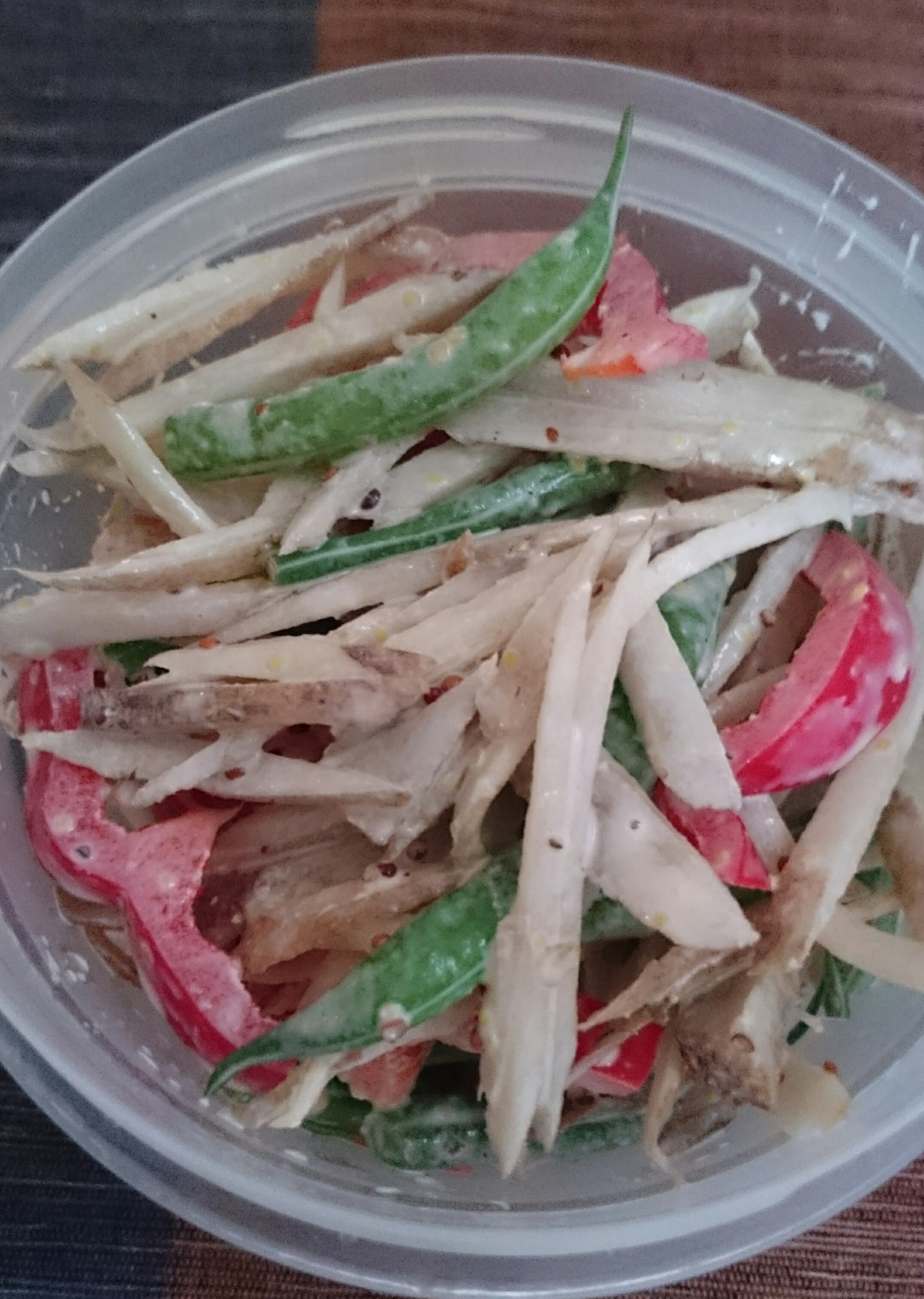 定番のごぼうサラダ。ニンジンがなかったので、いんげんとパプリカを入れました(^o^)。日曜日の午後は、来週のお惣菜をいろいろと作ります。平日はあまり料理に時間をかけられないので、作っておくと便利(^o^)。ひじきの煮物とか豆のサラダを作ったのですが、途中、味見をしていたら何だかおなかがいっぱいに……(;゜Д゜)。