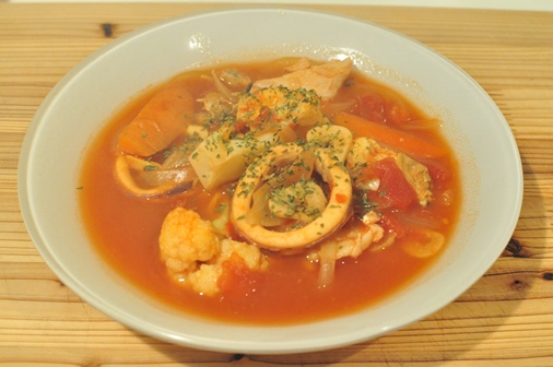 作り方は、1.スライスしたにんにくと輪切り唐辛子を炒め、2.玉ねぎ、にんじんを入れて炒め、3.いか、4.トマト缶、水を入れてスープを作り、5.カリフラワー、タラを入れます(タラは熱湯をかけて臭みを取っておきます)。6.酒蒸しにしたアサリの汁と身を入れて出来上がり。アサリは、そのまま入れてもOKでです。よく砂抜きをしてくださいね。