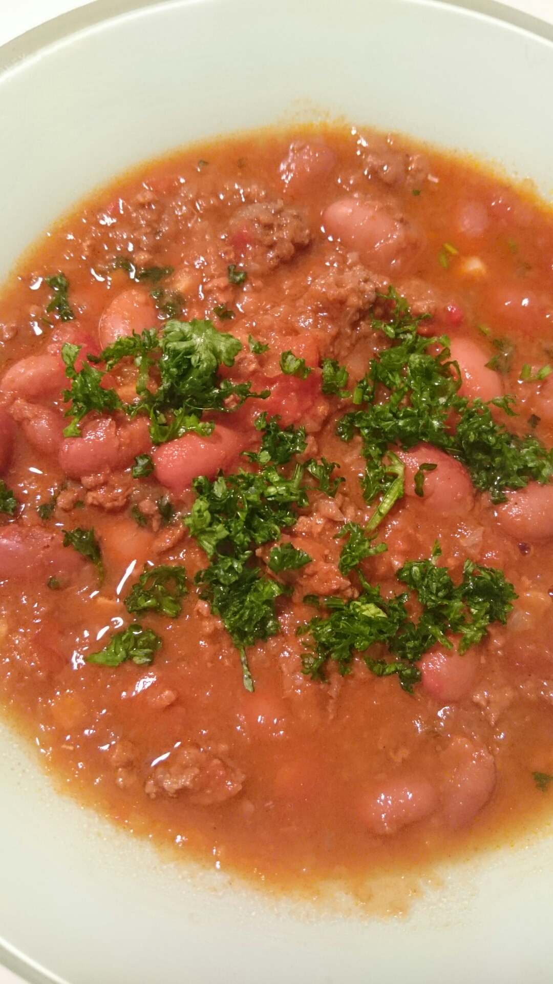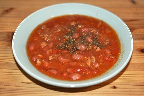 にんにく、玉ねぎのみじん切り、赤唐辛子少々を炒め、合挽肉を入れます。それからトマト缶と固めに茹でておいた豆と煮汁を入れます(お買い得の完熟トマトがあればベストですが、缶詰でも十分美味しいです)。私はカレーを作るときに使っているクミンとかコリアンダーのホールを最初に炒め、煮込み中にその他スパイス(パウダー)をいろいろ入れます。ローリエも忘れずに。アクを取って煮込み、ウスターソースを隠し味に少々入れます。豆が少し煮崩れてきてスープと馴染んだら塩で味を調えて出来上がり。