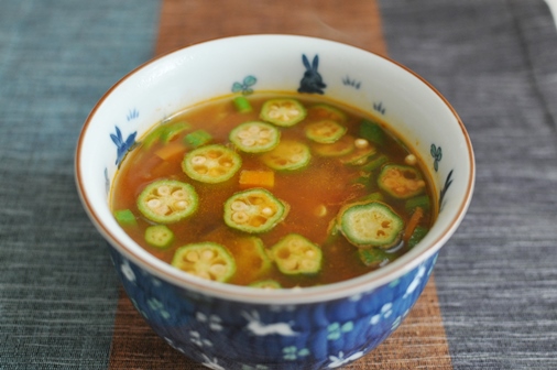 にんじん、茄子、やまいもなど。イロイロ入ってます。スープの本を見ていたら、野菜スープはセロリが必須アイテムだったのでぜひ入れたかったんですが、あいにくなかったのでちょっと香りが弱くなってしまったかもしれません。でも、トマト缶の残りと鶏ガラスープを入れて煮込んだら、なんだかおいしくなりました(^○^)。やまいもとオクラのとろみもついて、良い感じ。