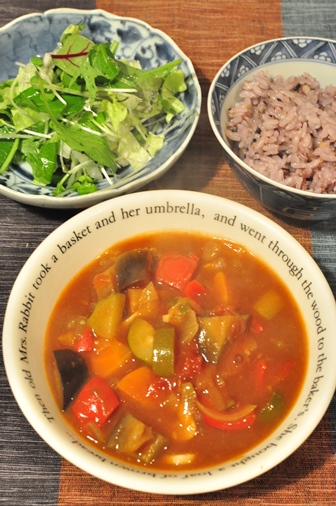 ラタトゥイユは野菜のトマト煮込みのことですが、これをカレーにするととても美味しい。夏のメニューかな。。。という気もするのですが、たまには野菜だけのあっさり味が、もたれなくて良いのです。こくがなくて寂しいときは、煮込み中に粉チーズなど入れると、ちょっとだけクリーミーになります。