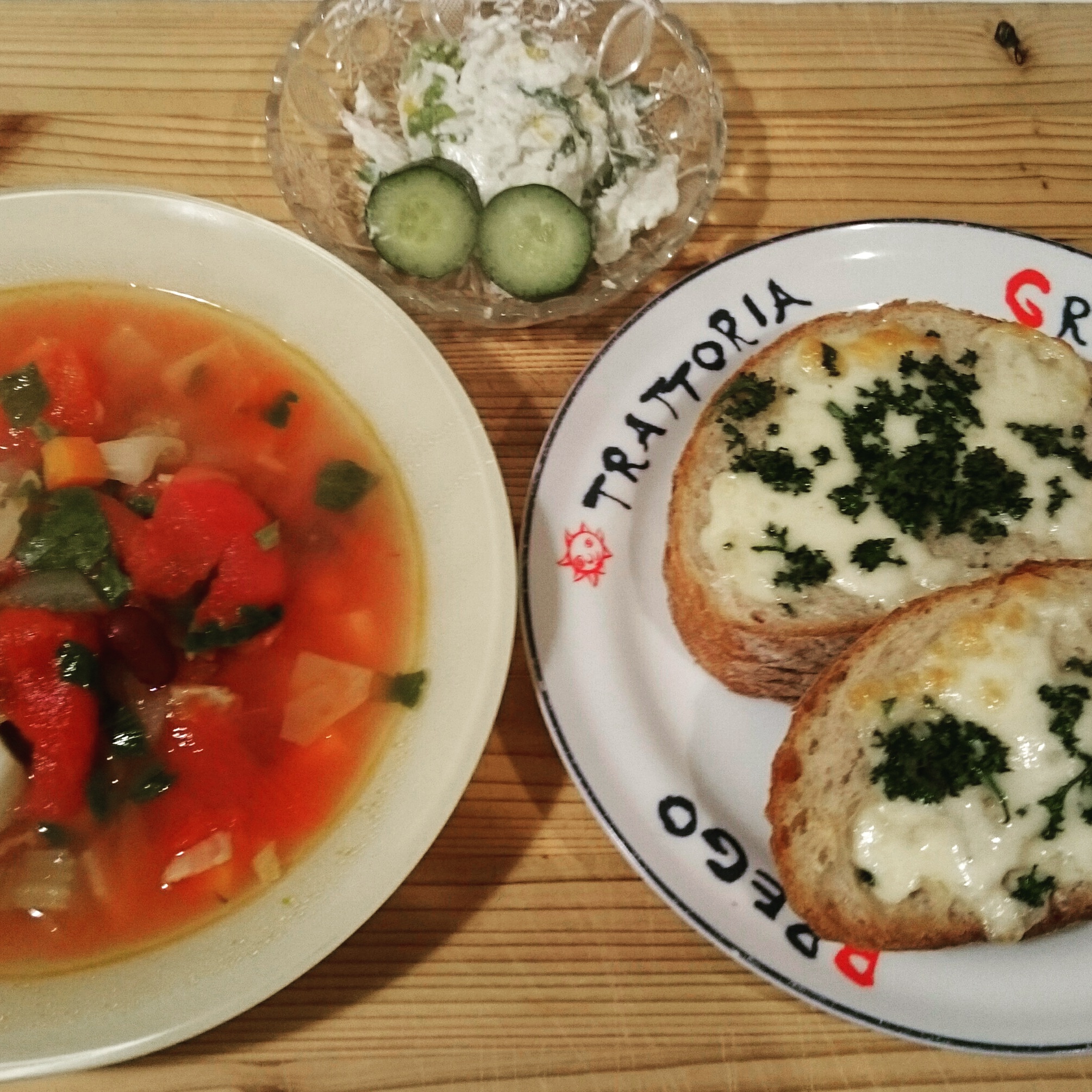 トマトのミネストローネとチーズパン(°▽°)。ミネストローネは、残り野菜何でもOK!あとセロリとローリエを入れれば味がまとまります。だしにはベーコンを炒めて入れるとこくが出ますが、なくても野菜だけで十分美味しい(^o^)。