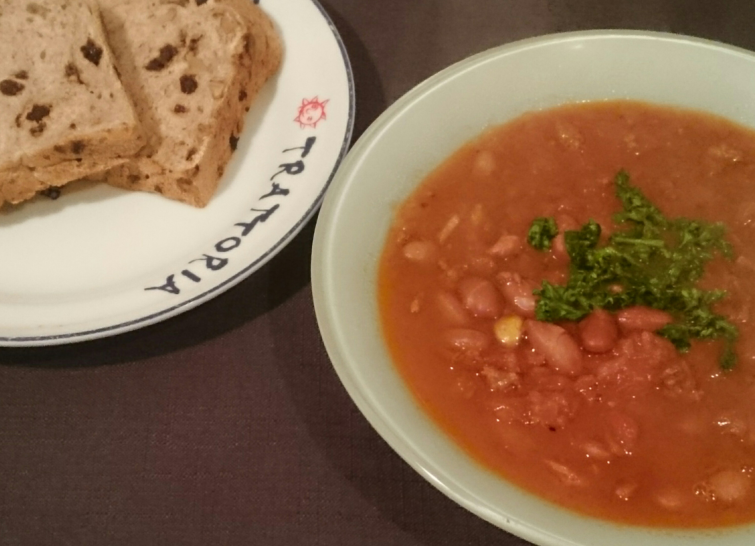これが好きで月に1回は作ってるかな?豆は金時豆です。ちょっと煮くずれたところがトマトソースと馴染んで美味しい✨一晩置くと、もっとなじんで、作った翌日のカレーのようにまろやかになります。一度、急いでいて缶詰の豆を使ってみたらいまひとつだった(-_-)。やはり豆からでるだしが効いてるんだろう……だしは、はっきりとわかる味ではないんだけど……豆は時間がかかるから嫌だ!とみんな言うけど、意外とすぐ煮えます(°▽°)♪知り合いに燻製を作るのが趣味の人がいて、ベーコンまで作ってしまうんですけど「豆は煮たことないなぁ‼たいへんでしょ?」と言っていた。ベーコン燻してる間に豆煮えますから(°▽°)‼♪