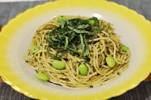 ふつうはバジルで作るパスタをシソで作ってみました。