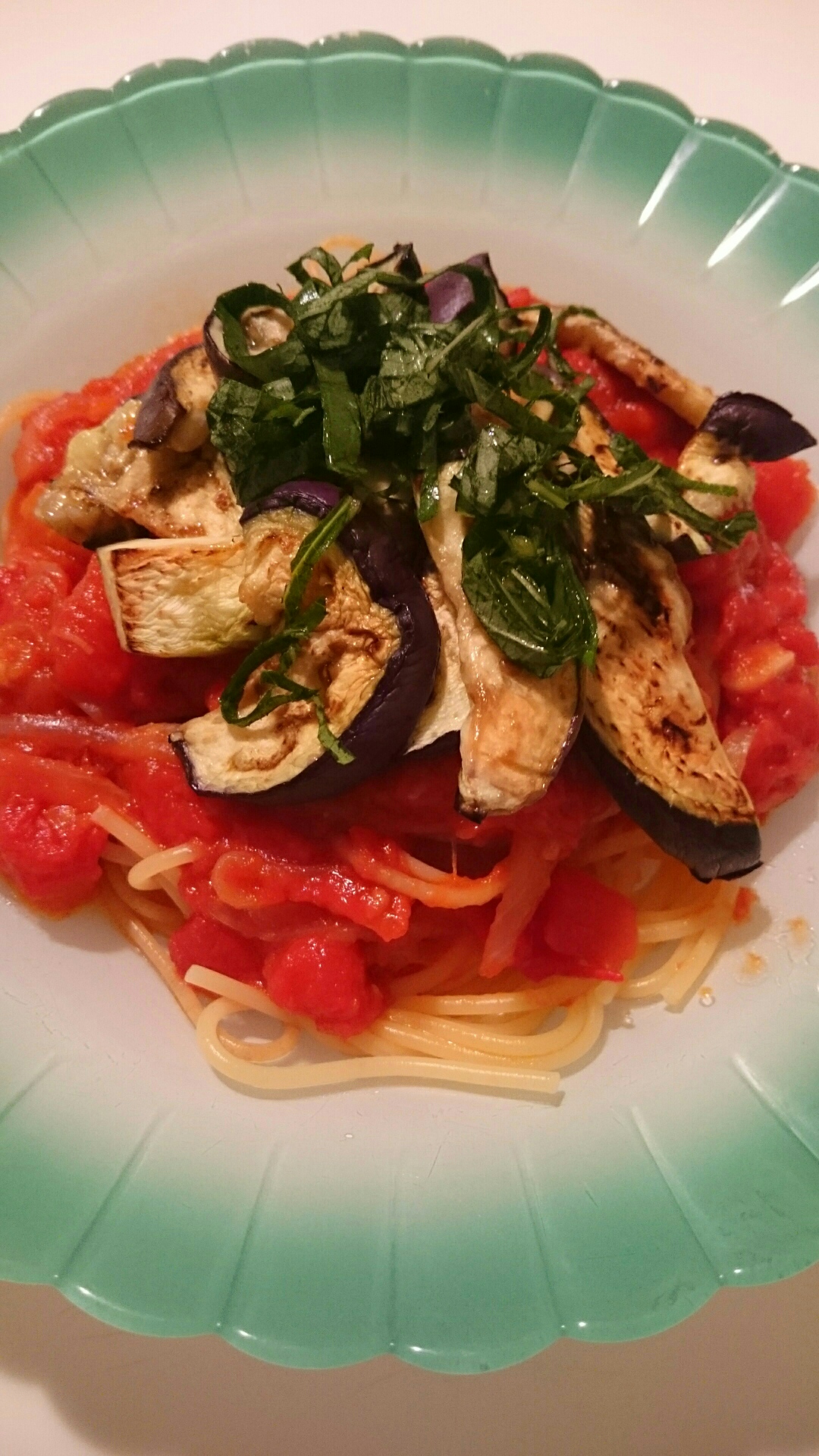 茄子はフライパンに薄く油をひき、熱くなったら焦げ目がつくまで焼きます。できたら取り出しておきます。次ににんにく、玉ねぎを炒め、トマト缶1/2を入れて煮込みます。塩で味を整えたら完成。そのあとゆであがったパスタ、バジル(または青シソ)と和えて盛り付け、茄子を乗せてできあがり。