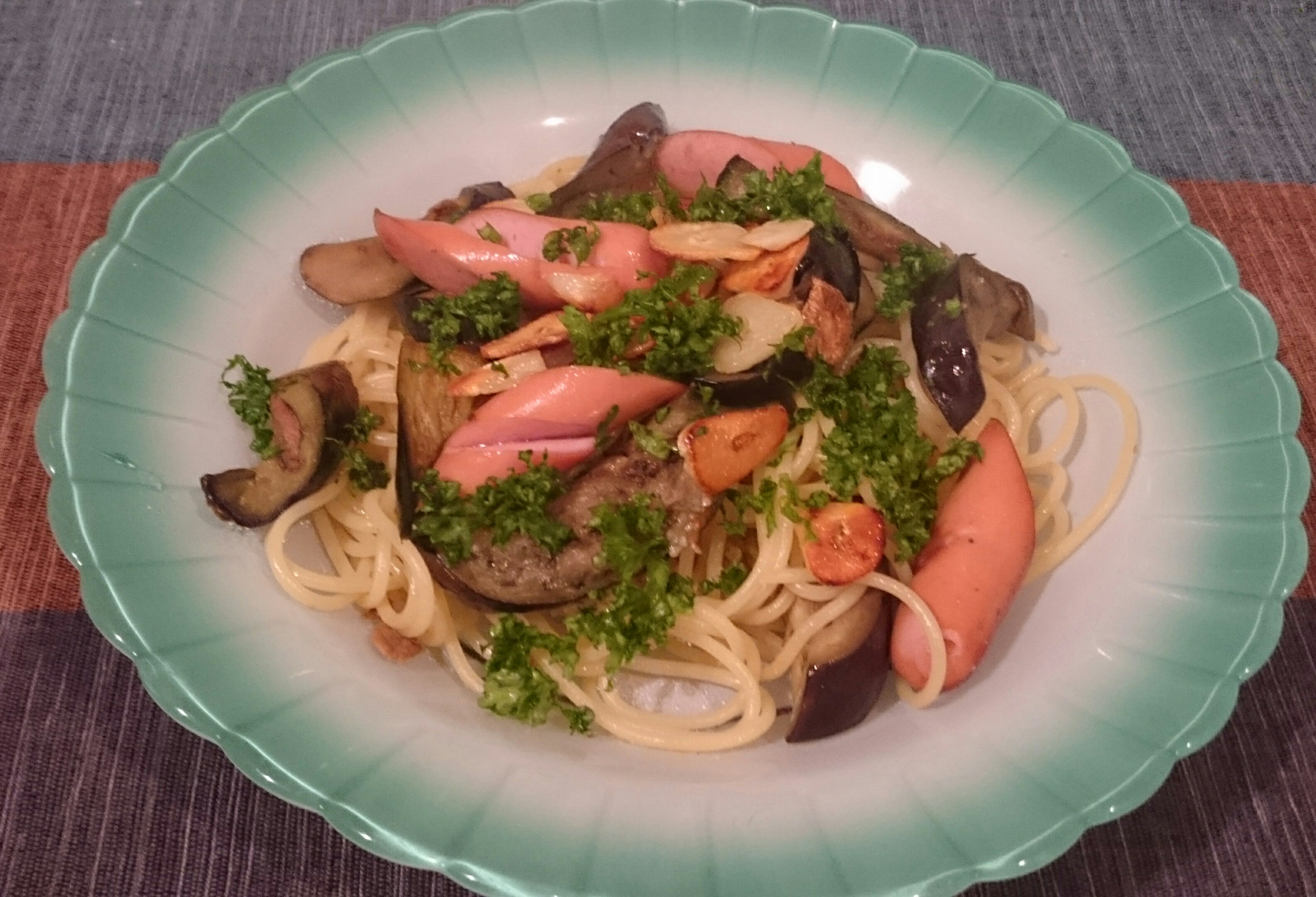 ペペロンチーノにいろんな具を入れたという一例です(^o^)♪カリカリに炒めたにんにくと輪切り唐辛子をいったん取り出し、茄子とウインナーを炒める。塩こしょうして、茹でたパスタと和え、にんにく、パセリをトッピングして出来上がり。にんにくの香りが移ったオリーブオイルで炒めるから、とっても美味しく仕上がります。ウインナーだと子どもっぽいから、鶏肉でもいいかなぁ…鶏のハーブ焼きに代えても美味しいかも……?