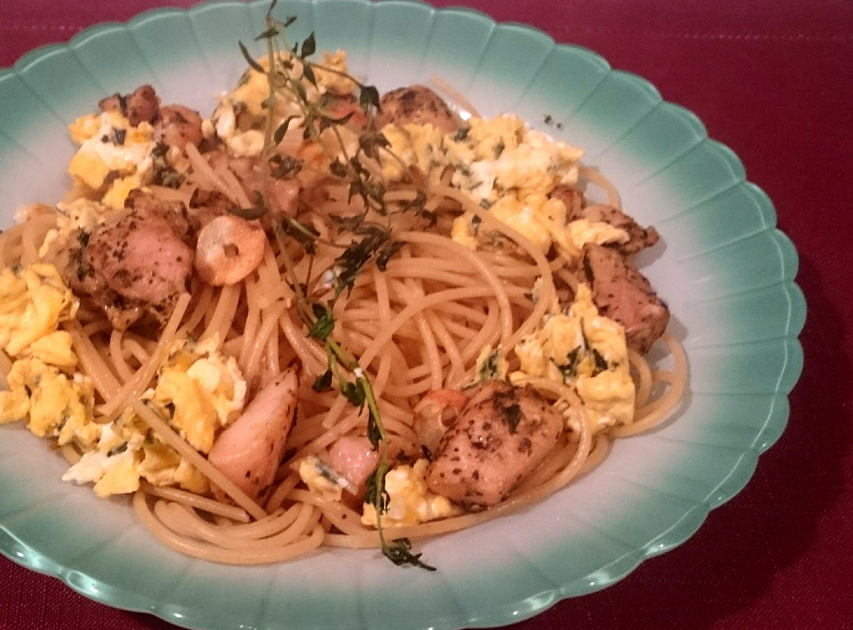 スライスしたにんにくを炒めて、乾燥ハーブ・塩をまぶした鶏を焼きます。茹でたパスタを盛り付け、スクランブルエッグを乗せたら親子パスタ(^o^)。タイムをたっぷり入れると良い香りです。溶き卵にもタイムを刻んでハーブ風味にしました。「親子丼」もいいけどこちらも美味しい。イタリアン風の味つけになっているので、ちょっとはオシャレかな(〃▽〃)✨