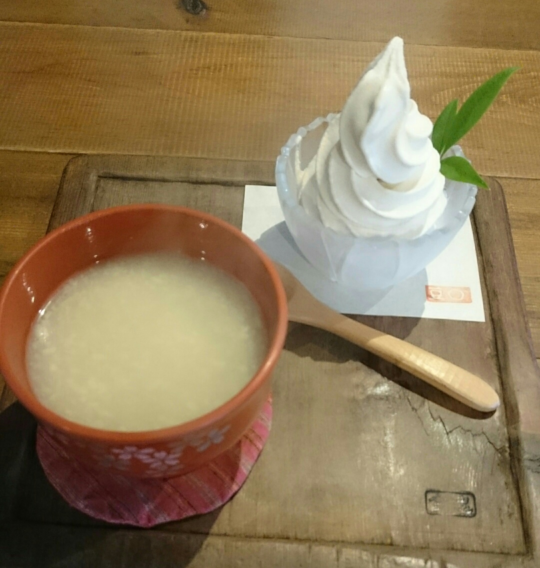 おたづき通りの酒屋さんが閉まっていてへこみましたが、さらに気を取り直して、その向かい側にある「まめまる」に入る。開いてて良かった!(^o^)隣にある味噌屋さんがこの喫茶店を開いているのですが、ここの味噌スイーツは絶品です。味噌しるこ、プリン、パウンドケーキなど色々ありますが、私は味噌ソフト。ん?メニューに「米こうじの甘酒」が。これは初めてだ……迷った挙げ句に両方注文。熱いものと冷たいのを頼む愚か者な私です(  ̄▽ ̄)。味噌屋さんは江戸時代から続く店で、いまのご主人で7代目なのだそうです( ゜o゜)。とてもお若いかたなのでびっくりしました。来年は味噌プリンを頂きに伺いますので待ってて下さい!(プリンに未練)