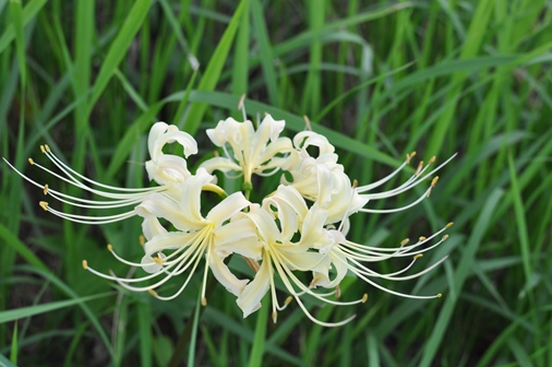 ふつうの住宅街なので歩いていて変わったものもなく、いつも同じ感じなのですが、写真のような、白い彼岸花を発見!公園の斜面にぽつりぽつりと咲いています。周りは雑草だらけだから、この花も野生なのかなあ??彼岸花は、お墓に咲いているイメージがあったので昔はちょっと怖く感じていたのですが、こうしてみるとなかなか綺麗ですね(^○^)