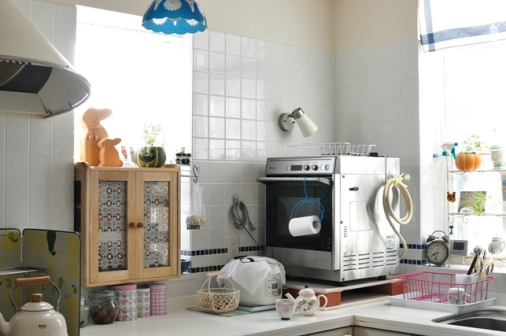 いちばん大きくて場所を取っているのは、角に置かれたオーブンです。流し台の下につけるタイプのものもあり、迷ったのですが、職場の先輩から勧められてこのオーブンにしました。ガスなので立ち上がりがとても早く、パンも美味しく焼けるのです(^○^)。以前使っていた電気オーブンが壊れてから、フライパンを熱してパンを焼いたりしていたので、とても重宝しています。