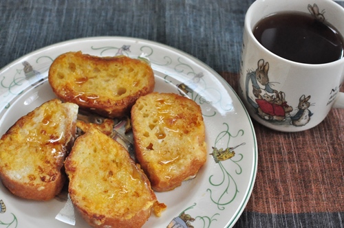 卵とミルクとお砂糖少々にパンを浸して、フライパンで焼きます。食べる時にハチミツをかけました。それと紅茶。