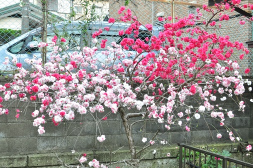 冬にだいぶ枝を剪定し、短くなってしまったので心配していたけど、こんなに可愛らしい花を咲かせてくれました。いちおうこれも紅梅というのでしょうか。ほかの場所で咲いてるのは、もっとビビッドなピンクですが、写真のようなちょっと淡いピンク色もとてもきれいなのです。