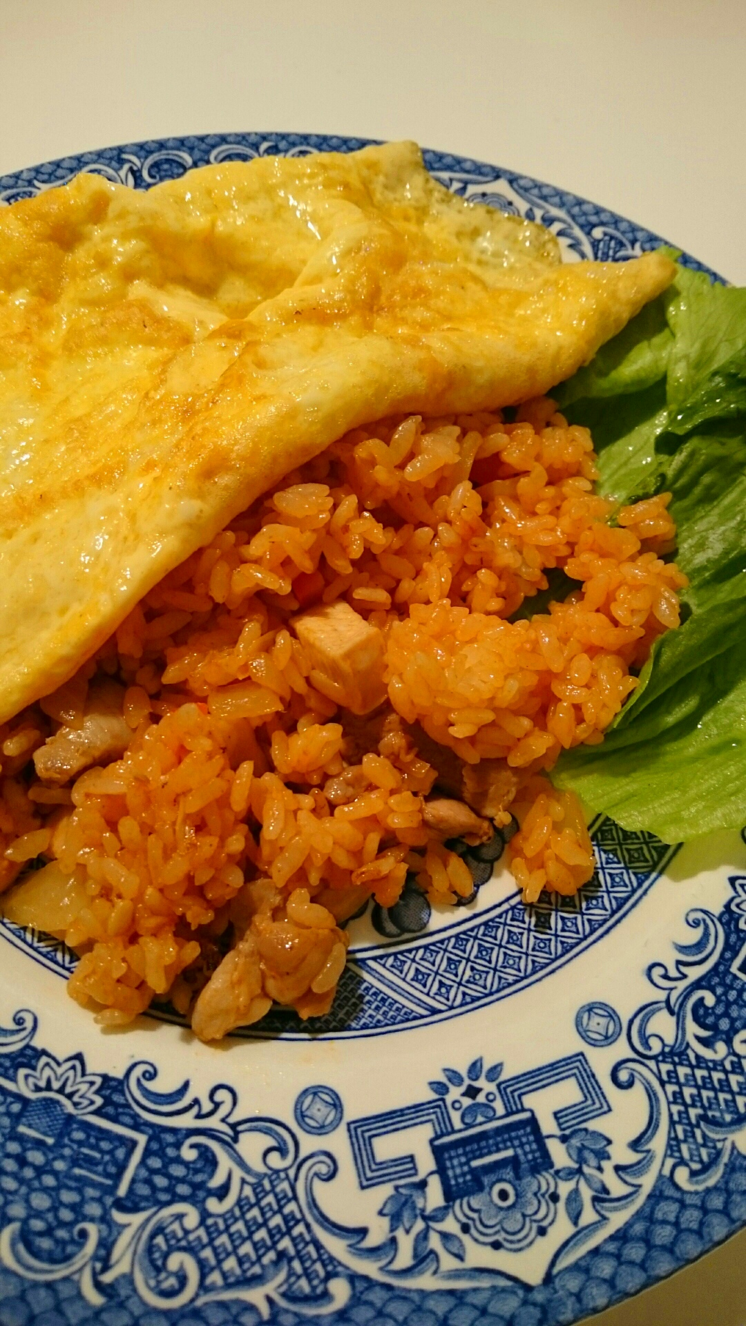 卵が残ってたのでオムライスを作りました。いつもはご飯を包み込むのですが、時々失敗してしまいます。今日のは卵を半円状にしてからご飯の上に乗せただけなので簡単(^o^)。でも半熟で仕上げてるのに、なぜか食べるときにとろとろになってくれない……もっと手早くしないといけませんね(^_^;)。