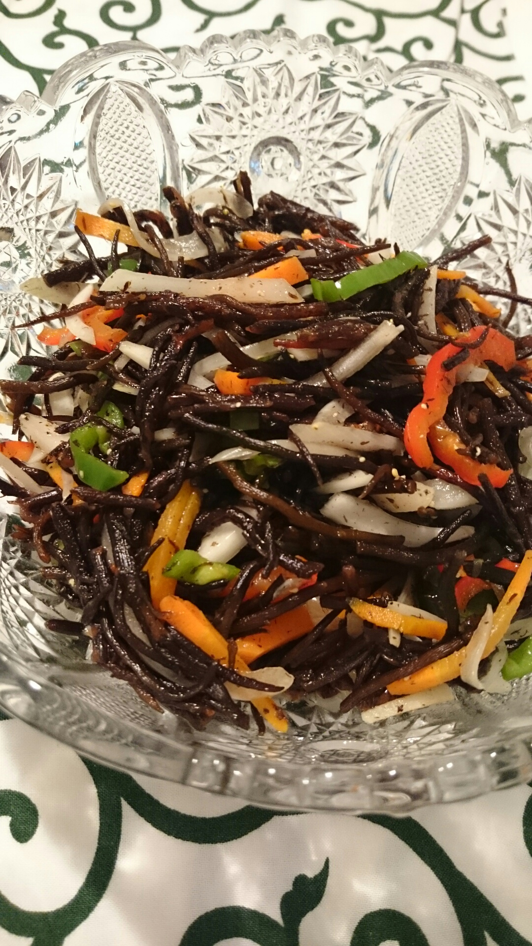 毎週のように作ってお弁当にも入れてるひじきの煮物ですが、こう暑いと腐りそうで心配。それにちょっと煮物という気分でもないので、さっぱりマリネを作りました(^o^)。まず、オリーブオイルでニンニクのみじん切りを炒めます。そこに戻したひじきを入れて、パプリカ、ピーマン、スライス玉葱を加えて軽く混ぜます。ボウルに移し、ドレッシングを和えて出来上がり。ドレッシングは、酢、醤油(だし醤油でも)、粒マスタード。