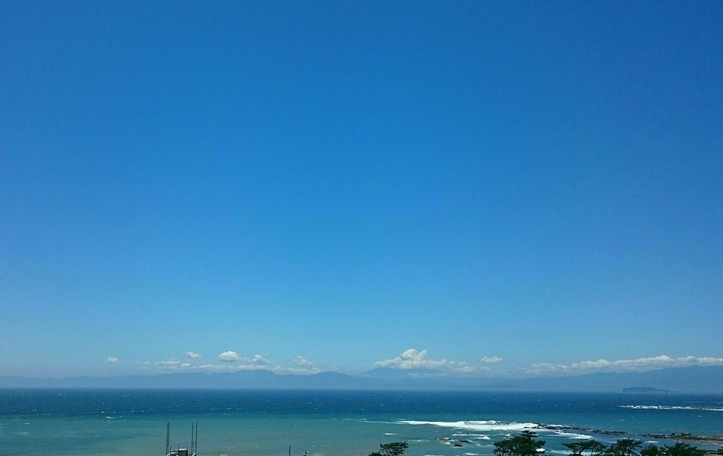 この景色は、私の勤め先から見える海です。いつもは晴れていてもうっすらとモヤがかかっているので、こんなにくっきり見えたのは珍しいんです(^o^)。雪化粧をおとした青い富士山も見えました。