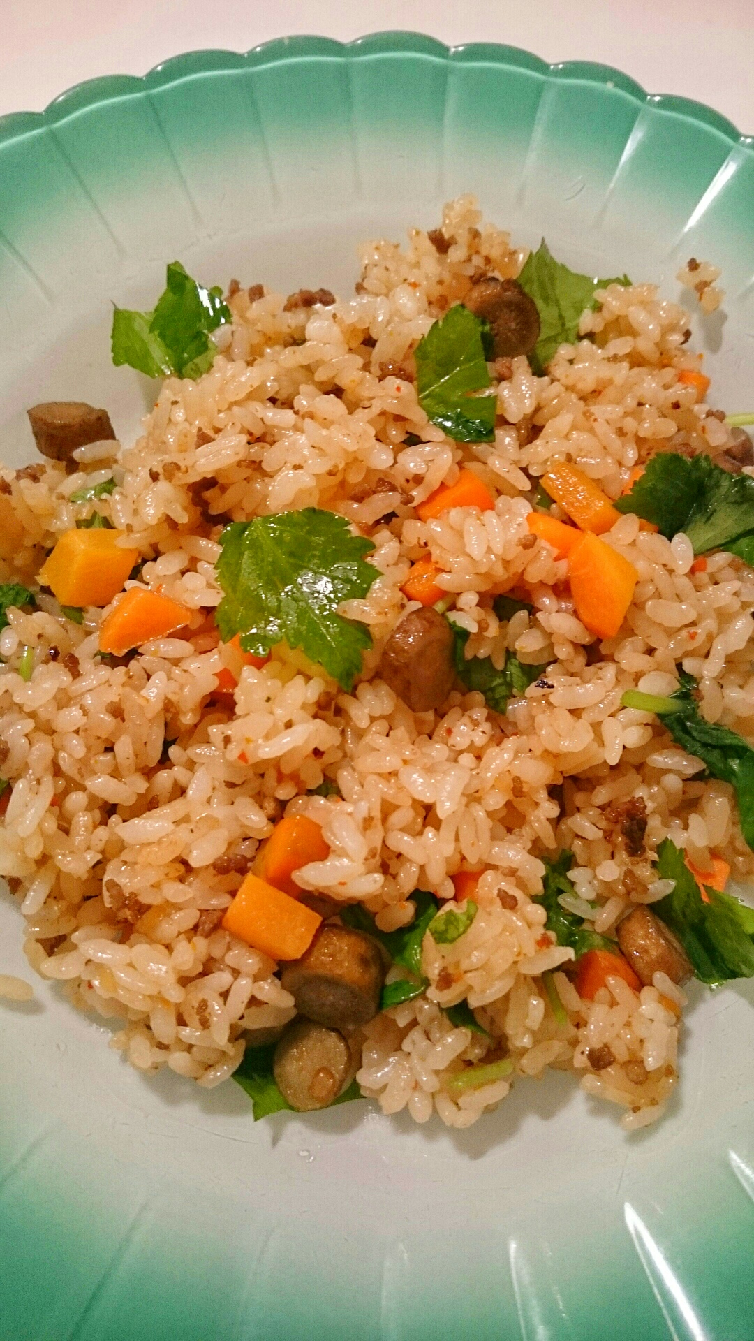 (笑)。今日のは乾物のホタテ貝柱が入ってとても良い風味。先日、中華街に行ったときにスパイスを買ったことを書きましたが、貝柱もお買得だったのです(^o^)。このチャーハンは昔、サライというおぢさんの雑誌に載っていたものですが、まだあるのかな?サライ。正式なレシピは覚えてないのですが、庶民の料理だからアレンジしても大丈夫。確かししとうと椎茸が入っていたと思うのですが、お好みで(^o^)。これはネギがたくさん入ってます。