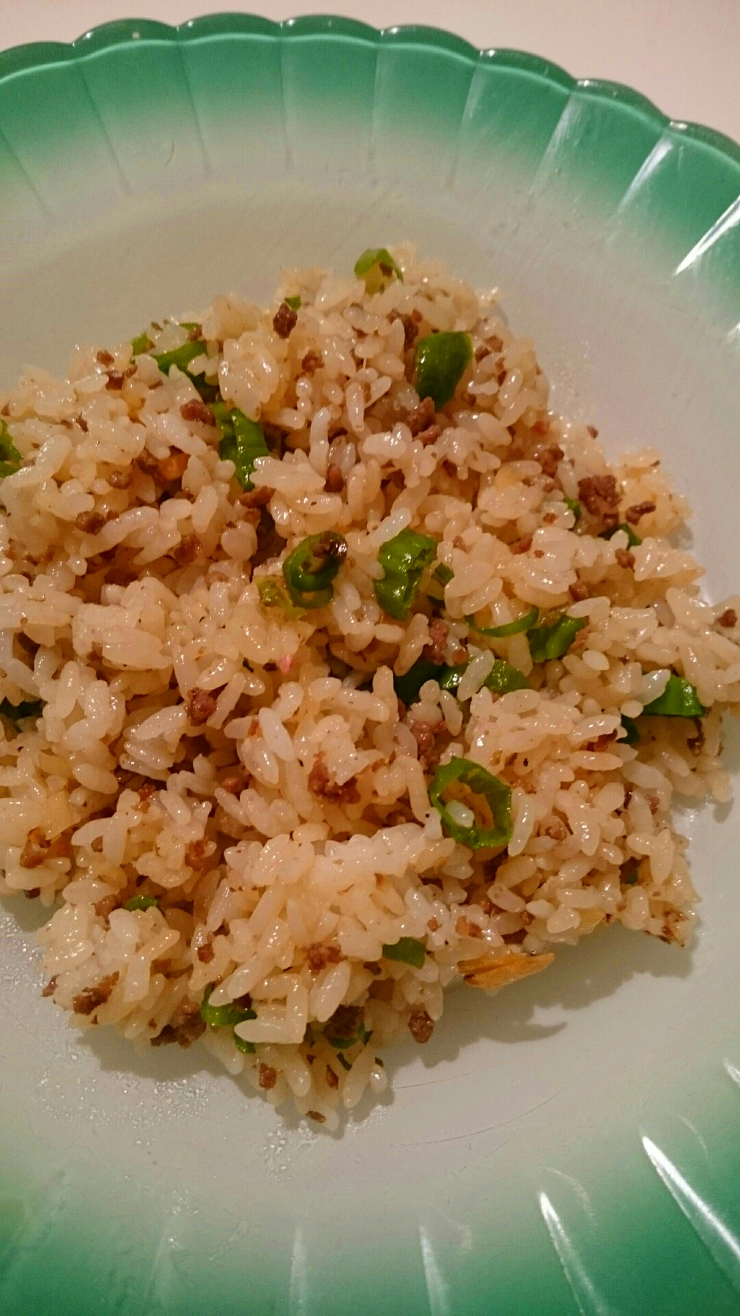 輪切りのしし唐が入った辛いチャーハン(^o^)。いつもは、下ごしらえのときに種を取り除くのですが、今日は丸ごと全部入れてみました。種の部分が辛いので、ヒリヒリしたらどうしよう?と思ったのですが、全然辛くなかったな……?(  ̄▽ ̄)