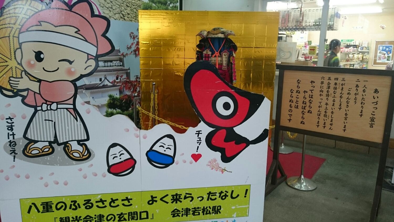 左側⬆八重たんいまだ健在(八重の桜キャラクター)。さすけねえ!というのは、大丈夫だ!という意味の会津弁。発音から、「差し支えない」という風にも聞こえていたので、なんとなく意味はわかりました。私は神奈川の生まれですが昔からズーズー弁はよく聞いていたので、耳が慣れてるのかな!?会津弁では、女性でも自分のことを「おれ」と言ったりするので、最初はちょっとびっくりしてしまいました(^_^;)。でも、以前旅行で行った、青森のこてこてなズーズー弁はまったく理解できず。青森弁は、発音が複雑でフランス語に似ていると言われているので研究すると面白いかも(どちらも赤ちゃんのことをベベと言うらしい!偶然かな!?(゜ロ゜))。