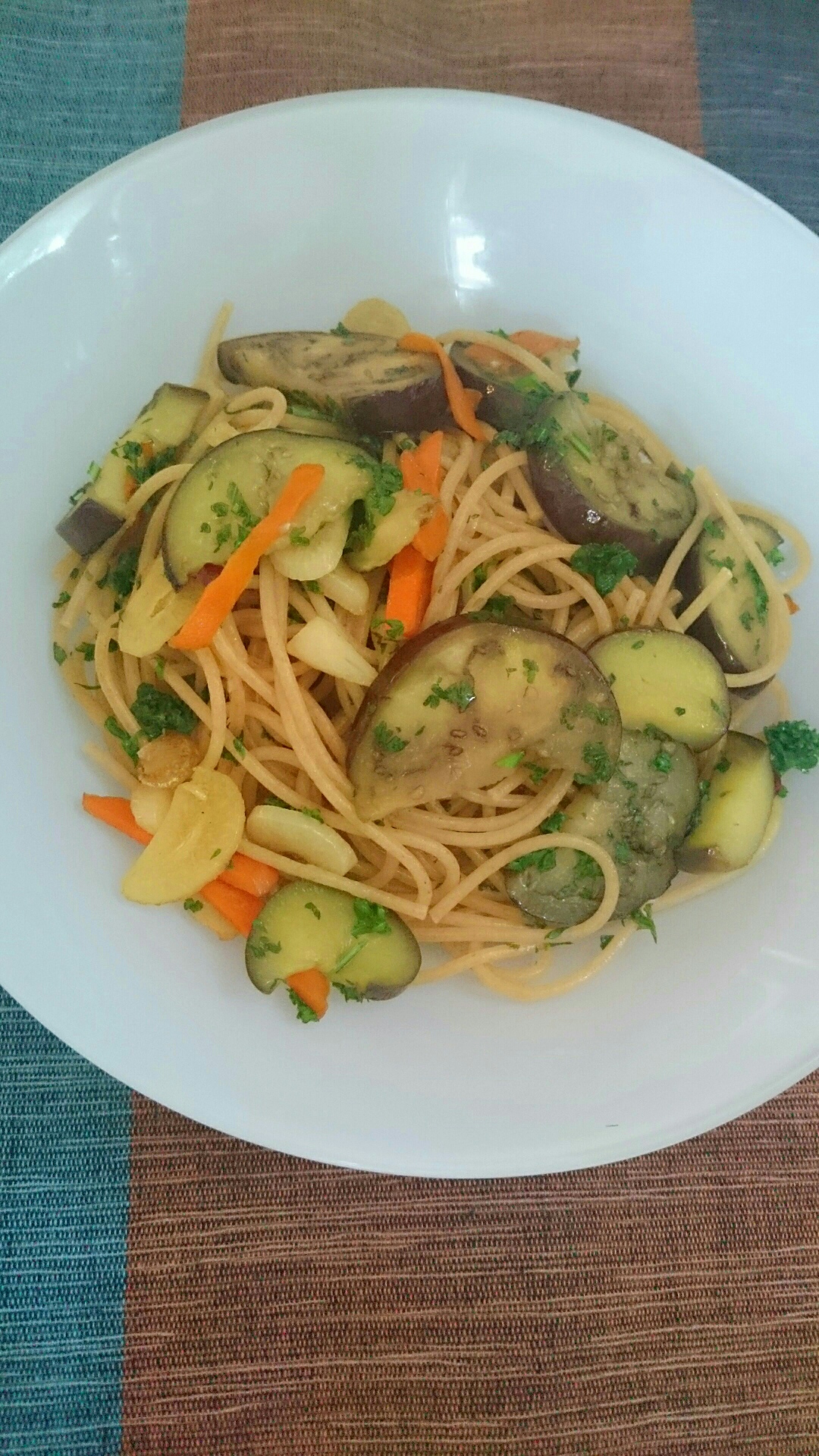 冷蔵庫にある残り野菜でペペロンチーノを作りました。キャベツとか入れるとすごく美味しいんですけど、あいにくなかったので(-_-)。でも、茄子で作ってもいける!ペペロンチーノは、にんにくとパセリだけのシンプルなものが本当のレシピなのかな!?初めてこれを食べた時は感動でした。材料も工程も少ないけど、シンプル料理って本当に美味しいとつくづく思ったものです。