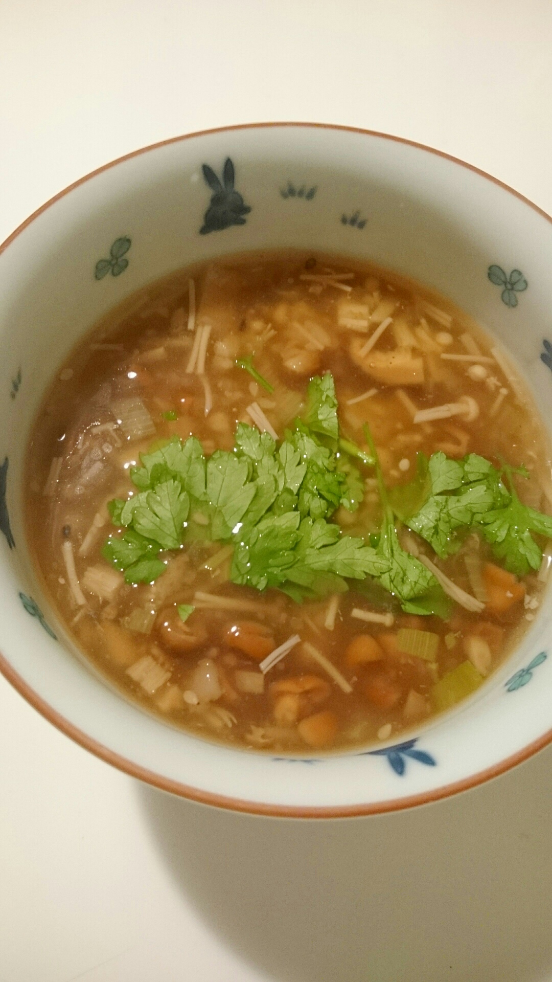 たくたん作って翌日はサンラータン麺。このラーメンは本当に美味しい‼体が温まります。ほうれん草のおひたしが残っていたので最後に彩りとして入れる(^o^)。その他、ハトムギなど雑穀と一緒にスープジャーに入れてランチに持って行くとこれだけで一食になります(^o^)。