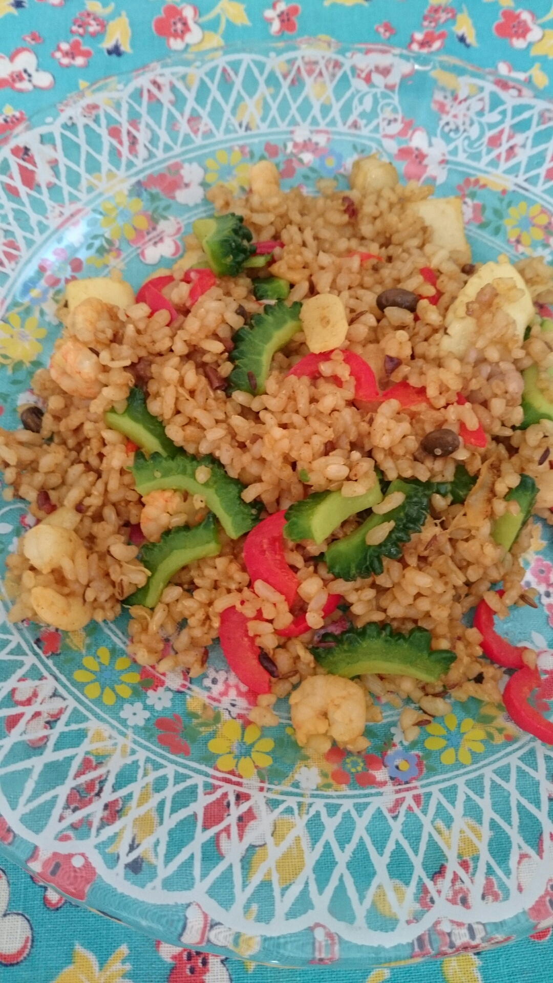 昨日の玄米ごはんの残りです(  ̄▽ ̄)。玄米は、ぱさっちーな食感なので、チャーハンは上手く作れます。冷凍庫に、いつか使おうと思って買っておいたシーフードミックスがあったのでこれと、残り野菜を入れました。最初にクミンとコリアンダー(ホール)とにんにくをよく炒め、パチパチしてきたら具材とごはんを入れ、塩、カレー粉を振りかけて出来上がり。
