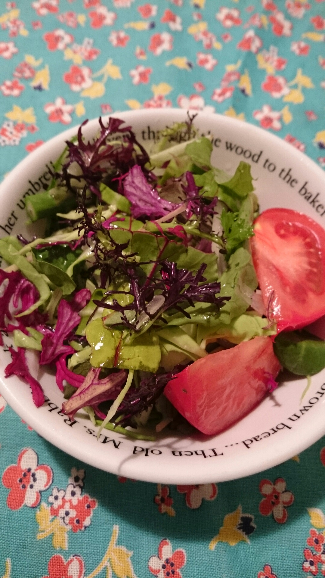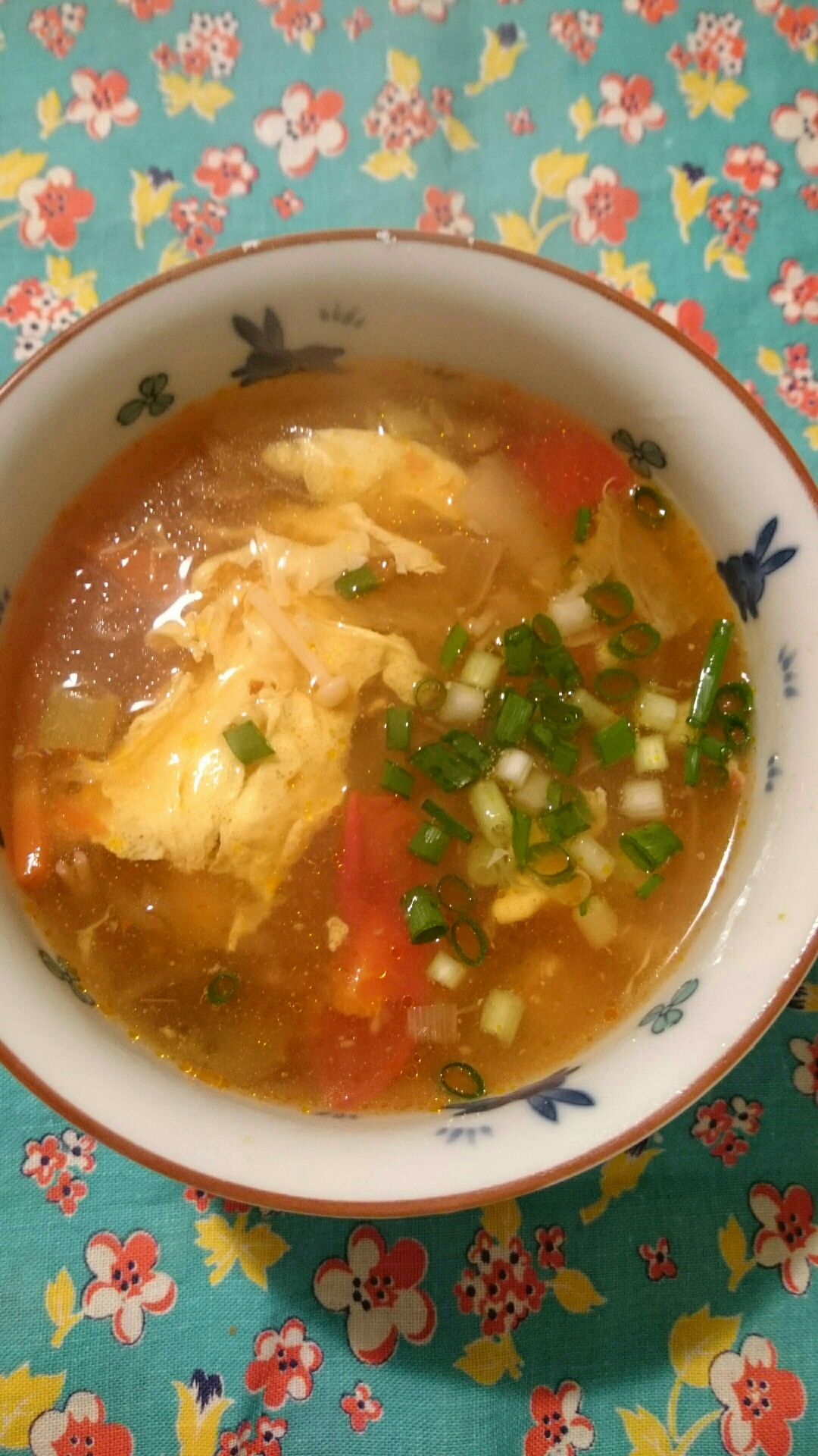 本物のサンラータンスープとは違うかもしれませんが、辛くて酸っぱいこの味にハマります。ザーサイが残ってたのでこれと、ミニトマトを切って入れました(^o^)。トマトの旨みがよく合う…