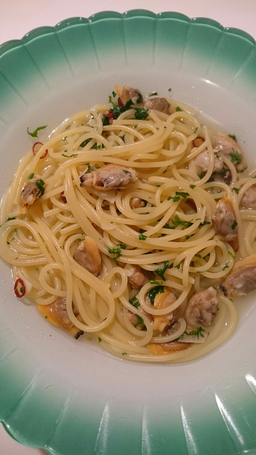 簡単だけどよいだしがでるあさりのパスタ(^o^)/にんにくと赤唐辛子を思いっきり入れるのが美味しいんです!フライパンで炒めていたら、唐辛子にむせた!入れすぎかな(^_^;)。あさりは、酒蒸しにして殻を取り、身と汁に分けておきます。ゆで上がったパスタをフライパンに入れ、実と汁を一緒に和えたら出来上がり。最後にパセリを散らします。いつも火を入れすぎてあさりが小さくなってしまうのですが、またやってしまった……。だしが出尽くしてるから、身は出がらしのようなものですが……。このパスタは、トマトの刻んだのや玉ねぎなどを入れても風味が変わって美味しいですよ(^o^)/