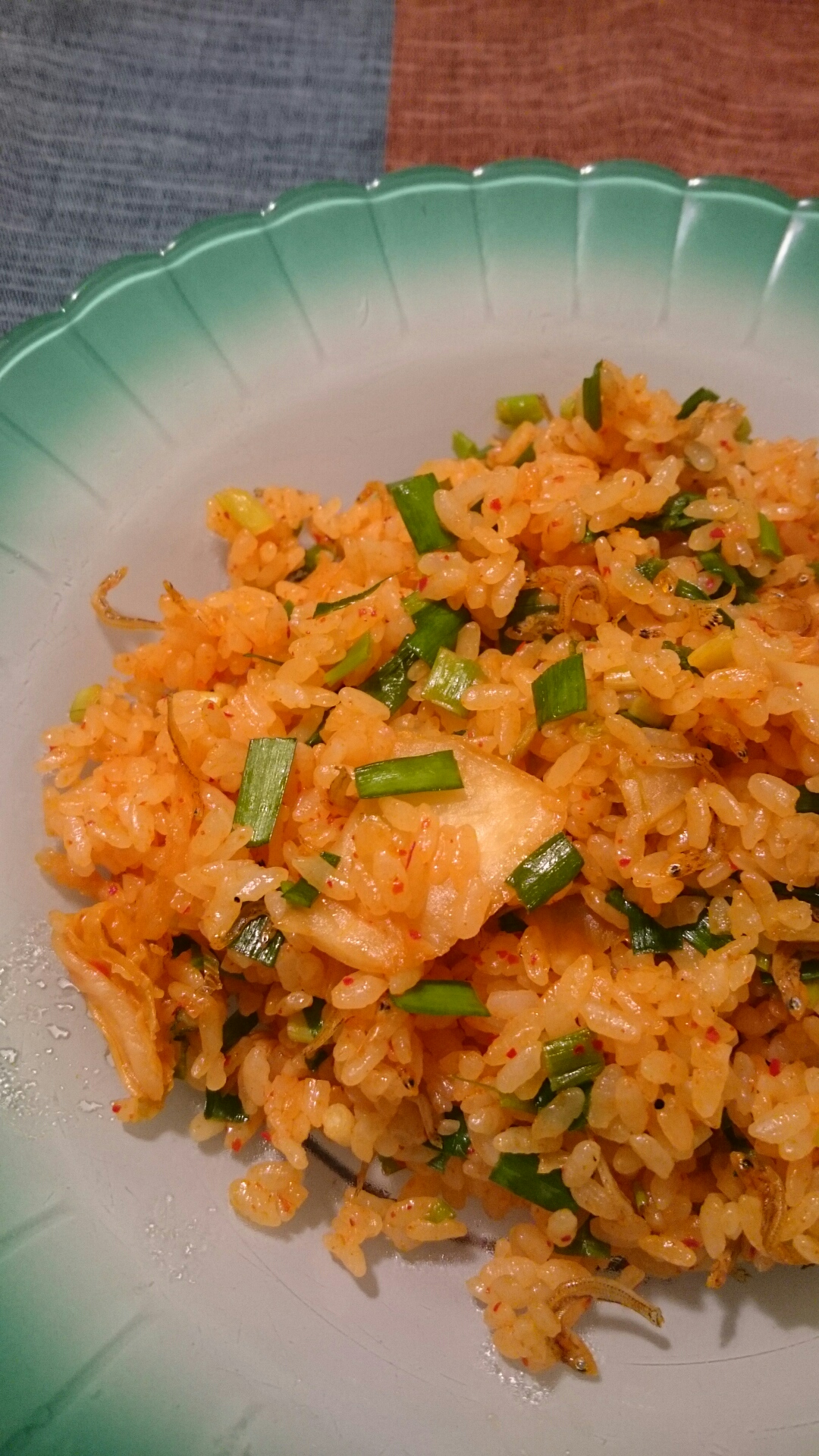 じゃこを香ばしく痛め、キムチを入れたチャーハン。冷蔵庫にコチュジャンがあったはずだと思いだし、これも入れてみました。仕上げに刻んだニラを入れて出来上がり。味付けは塩を少々。キムチ鍋などもそうですが、漬けてから少し時間が経ったキムチの方がおいしいです。乳酸菌が増えるから?すっぱい古漬けの白菜などは大好きです。葉っぱのところをご飯に巻いて食べるのが気に入ってますが、最近食べてないなぁ…