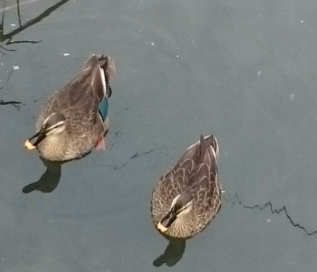 通勤途中にある川に、鴨のつがいがいます。オシドリではないけど仲良く泳いでます。この川の少し離れた所で、猫が水を飲んでいました。会社も世の中もこんな風に平和ならいいのに…(-_-)。橋の上から写真を撮りましたが、携帯を落としそうになって焦りました(゜_゜;)。