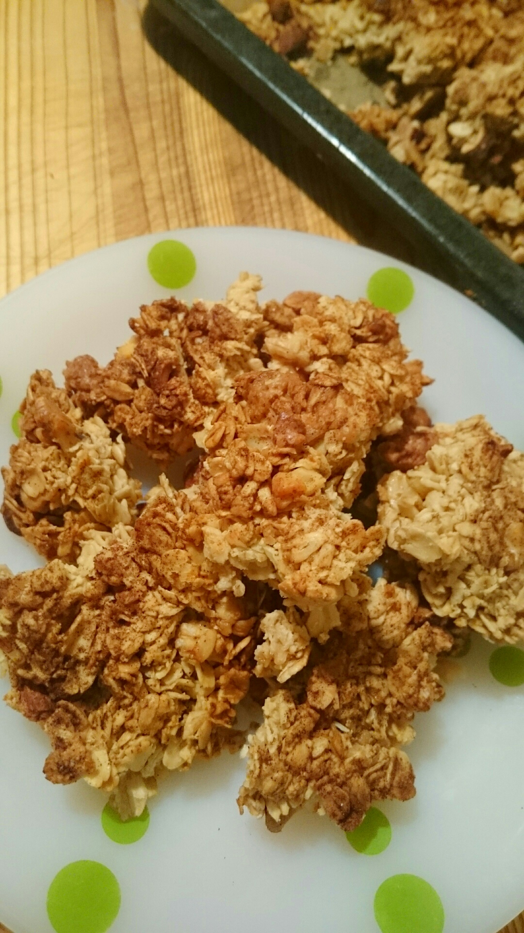 クランブルはそぼろ状に焼いたお菓子で、ケーキのトッピングに使ったりしたことがありますが、今回はオートミールを主役に作りました。バターと砂糖(今回は甜菜糖)を溶かして混ぜ、刻んだ胡桃とアーモンドが入ってます。バナナやりんご等フルーツを入れて焼くのが普通みたいですが、サクサクにしたいと思ってナッツだけで作ってみました。